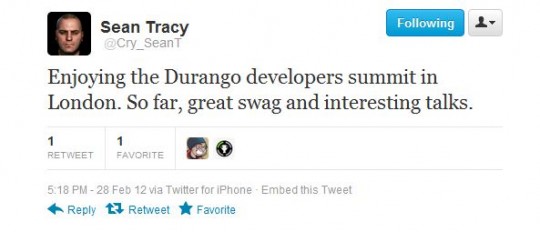 But now some new information has surface tying both the Crytek and Kotaku rumours together, all courtesy of a single tweet today from Crytek developer Sean Tracy. The tweet read, ” Enjoying the Durango developers summit in London. So far, great swag and interesting talks”. The tweet has since been removed and, in a strange turn of events, his Twitter account has also seemingly vanished as a search for that username turns up nothing. Perhaps he was simply annoyed at being unable to tweet anything without lots of people grabbing screenshots of it, but can he really blame us when it’s so interesting? Everyone likes a good conspiracy!