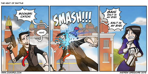I also can’t talk about Elizabeth without mentioning her super healing abilities. That woman can revive you from anything. Burned to death? No problem, she’ll fix you right up! Bullet through the eye? HA! Not even a challenge for Elizabeth. She is a miracle worker, one that should be immediately employed within the medical industry. But where exactly did she learn this? Early in the game it’s explain that she learned her skills from reading books, like her freaking mad lockpicking skillz, but reading a book and putting first-aid skills into actual real-world use are very different things! And reading books doesn’t explain how she can seemingly bring Booker back from the brink of death no matter what happened to him. I also found it funny that when you die, you lose some money. I’m fairly sure that as your vision blurs and fades, that’s not Elizabeth trying to bring you back, that’s her nicking the money from your wallet for services rendered.