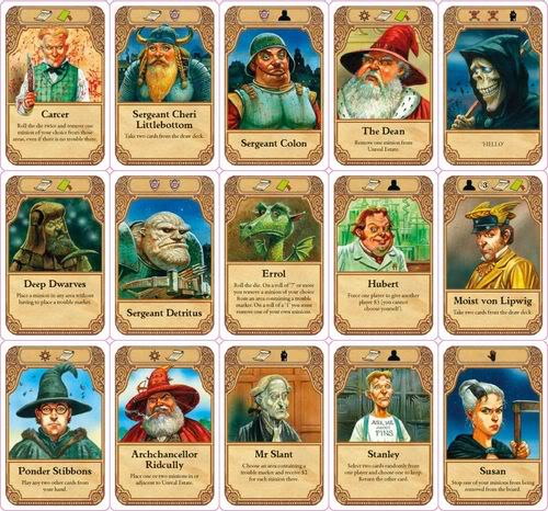 Gameplay mechanics aside I feel that the theme of the game works well. As a Discworld fan I couldn’t help but feel a thrill when I drew a card with the with hooded skull of Death etched upon it, his grin leering at me and his ability to assassinate two minions making him especially useful. I couldn’t help but enjoy the fact that playing the Nobby Nobbs card let’s you steal $3 from another player, or that Rincewind is the only green card in the entire game with an Event symbol, because Rincewind always turns up where you least expect him and with trouble right behind him. I loved battling for control of a city that I know so well, using characters and locations that have been a part of my life since I was but a child learning to read. I loved that minor characters and major characters alike are included. As a fan of Terry Pratchett I simply loved this game.