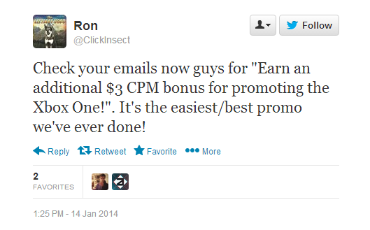 A Tweet on the official Machinima Twitter account appeared stating that anyone promoting the Xbox One would earn an extra $3 CPM, which amounts to $3 for every one thousand views. The Tweet has since been deleted, but not before an image of it was grabbed.
