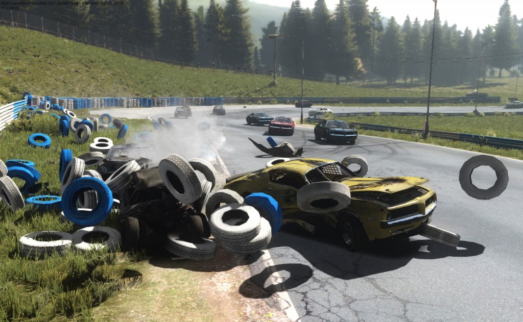Yet it was in the lunacy of a 24-card race that my appreciation for the Bugbear’s work really began to show through, the sheer destructive capabilities of the engine working in tandem with satisfyingly weighty handling to create a challenging racing experience, one that I almost immediately fell head over heels in love with. With so many cars on track the first corner closely resembles World War II in a highly localised area, entire cars spinning through the air before crashing into the pack sending shards of metal flying. It’s while plowing headfirst into this mess, witnessing cars crumple and concrete barriers wrecked, that realisation dawns: despite the seeming encouragement of the on-screen destruction this is a racing game that demands patience and careful control of the throttle. Scream into the first corner and you might just make it out alive, but it’s far more likely that you’ll end up nearly destroyed. The smarter option is to go in careful, picking your way through the inevitable pile-ups, contacting other cars when its beneficial to you. It’s like a tactical shooter: you line up the perfect shot, and take it when you need to. Smashing into others is tons of fun thanks to the convincing way that they crumple, but a well placed slam into the side of another car can send them spinning into a wall with minimal fuss, and so every race is like a deadly dance, one that’s flirting with you, trying so hard to simply make you hit the accelerator and ram everything, only to lose it all. The steering has a real sense of weight to it, still far from the deadly lands of realism but nowhere near being “Arcadey” either. Perhaps the best way to think of the handling is believable. You can believe that this is what cars of this nature handle like, even if you know it really isn’t. In its current form driving the vicious muscle car requires some deft throttle work as it likes to step out and spin the wheels, slowing you down. To my surprise I’ve only recently began earning podium finishes and I love that fact. Next Car Game isn’t forgiving; it wants you to try hard.