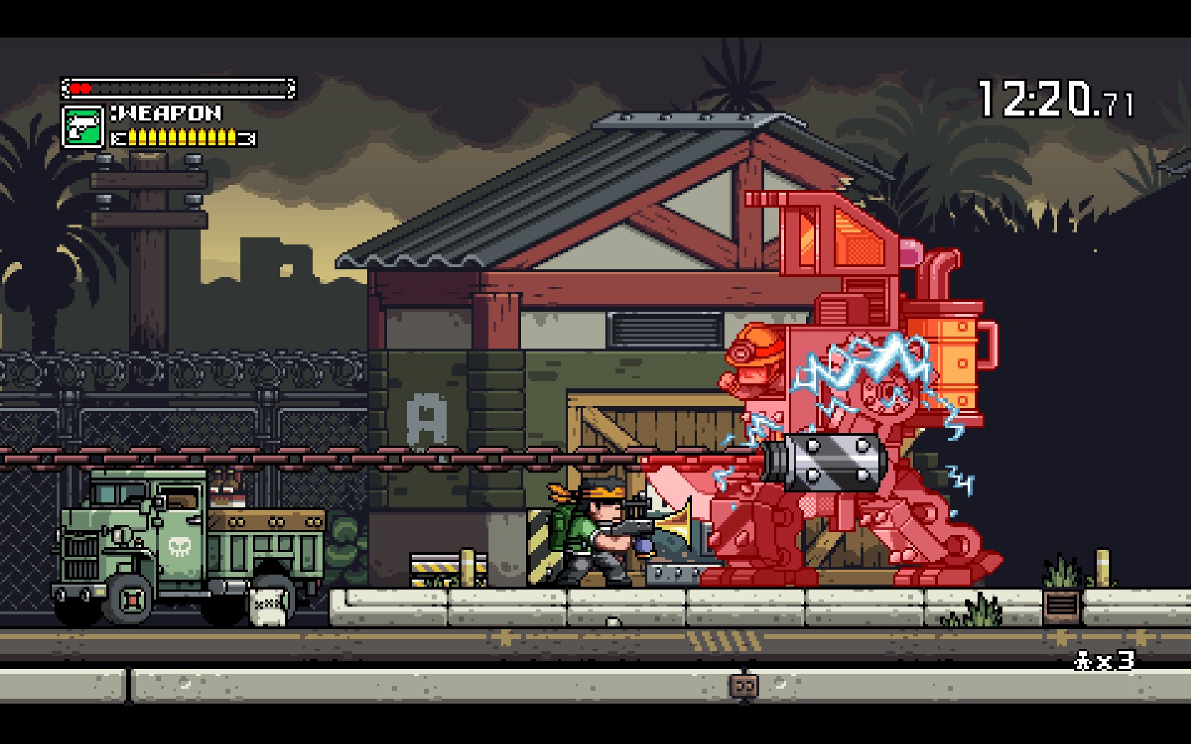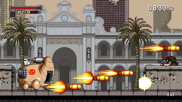 As a nostalgia driven, side-scrolling shoot-fest Mercenary Kings adheres to a strict game design in order to replicate the so-called glory days. You can only fire your gun vertically or horizontally, thus careful positioning is key, and enemies follow a very strict pattern of behavior which they never deviate from, presumably because they’re afraid to invoke the wrath of the Programming Gods. Naturally you can jump for some light platforming action and to avoid enemy fire , but your overall speed and ability to leap are somewhat restricted by weight, so you’ll have to keep an eye on how heavy your chosen weapon is and adjust accordingly. Jumping also feels strangely heavy and clumsy, and there’s a slight delay between pushing the button and actually getting airborne, which feels unnecessarily awkward, as does the strange arc that your character follows. Adding a little more complexity is that you can also perform a fast roll to avoid attacks, and reflect bullets with your knife, a handy skill to master, especially toward the latter stages. From this the team at Tribute build a solid set of gameplay mechanics which rely solely on your reflexes, skill and ability to memorize how each enemy type works. It’s a far cry from the bombastic approach of modern military shooters, and therefore a welcome change of pace.
