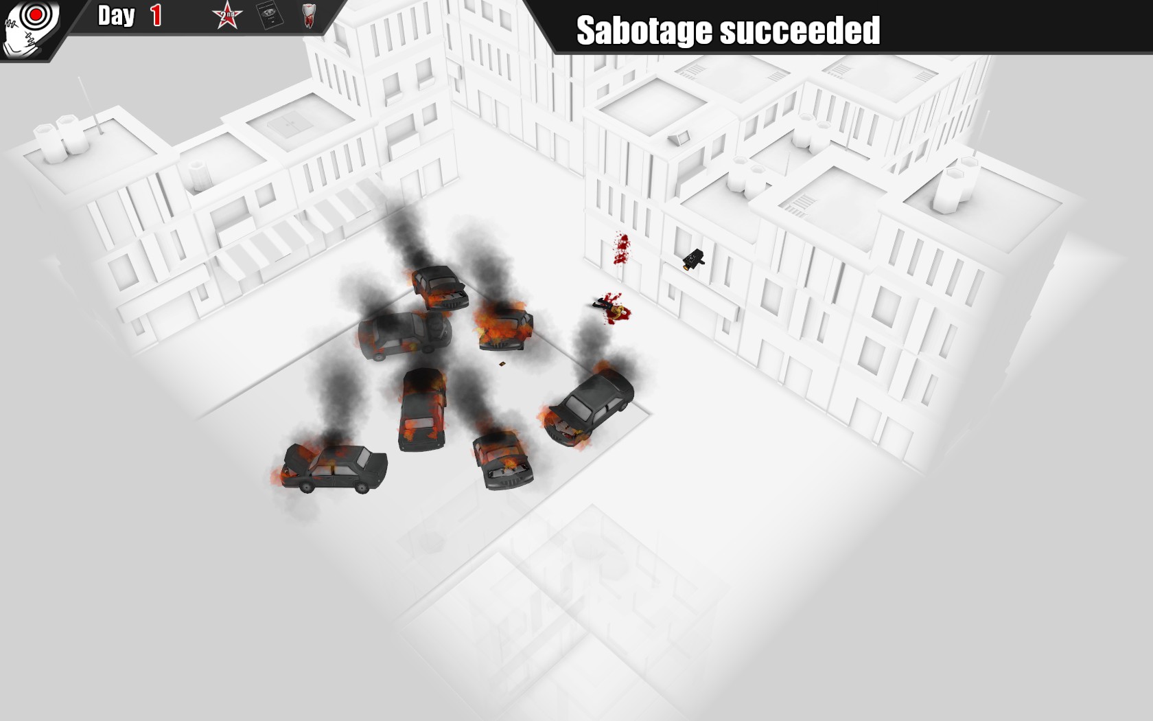 The user interface also presents some small problems, largely because it seems to have been designed with mobile gaming and tablets in mind. Sabotaging items or activating them usually involves having to use a slider, which isn’t an irritation until you’re attempting to do things in a hurry, at which point manipulating a slider feels clumsy and pointless. Doing things in a rush is further hampered by the fact that to move the screen around you hold down the mouse click and drag. Again, this is fine in a calm situation, but when you find yourself needing to do something quickly it’s very, very possible to find yourself attempting to click on a small item and use it, but actually grabbing the map and slinging your view madly around the screen. To launch a stationary car you must hold down the mouse button to charge it, and release when you think you’ve reached the right amount of power. The problem is judging this is terribly trial and error in nature. During one mission I needed to launch a car using a ramp and squish the bad guy. What followed was a frustrating number of restarts. I’d hold the button down and launch, only to see the car hit the ramp and stop. The next time I’d hold the button down for what felt like a mere split-second more, only for the car to fly over the bad guy’s head. Even dropping a crate from the top of a building can become annoying, as the slightest movement in the mouse sends it too far off course, while getting the timing right on this and other things involves some serious guesswork.