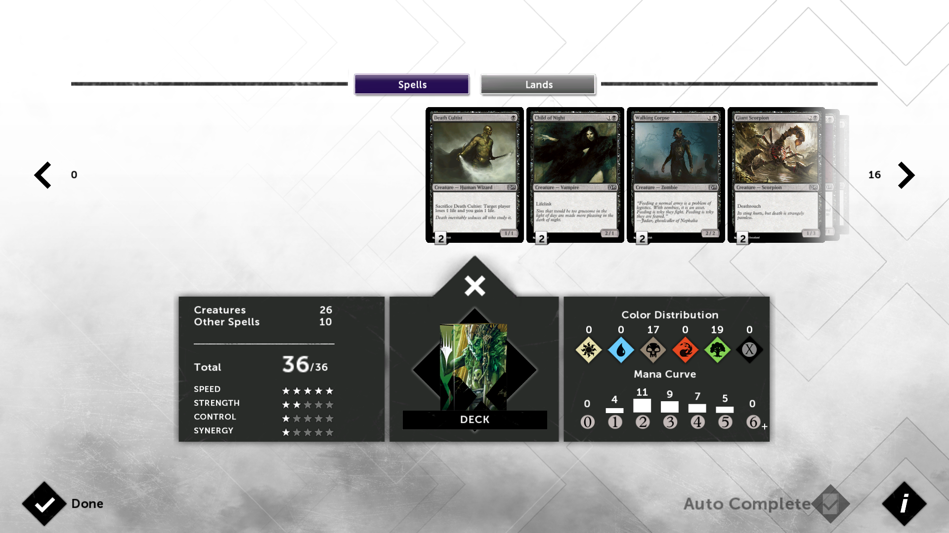 Victory against either an AI opponent or real person via multiplayer grants you a booster pack to rip open, giving you a random assortment of cards that can then be added to your existing deck or used to create an entirely new one through deck manager interface. In this mode you can filter cards by colour, mana cost or even rarity, plus name your deck and assign it an image. Strangely enough, though, there’s no search ability. You can also find some handy statistics detailing the exact number of cards in the deck, the mana cost curve and even a set of ratings assigned by the game that judge your work based on the deck’s speed, strength, control and synergy. You can also ask the game to finish creating your deck for you, a handy idea for new players feeling a little overwhelmed, though generally I found it to be unreliable. Land cards are added automatically, but you can choose to handle it manually, which is recommended because there were a couple of occasions when the game chose to give me Land from the wrong colours.
