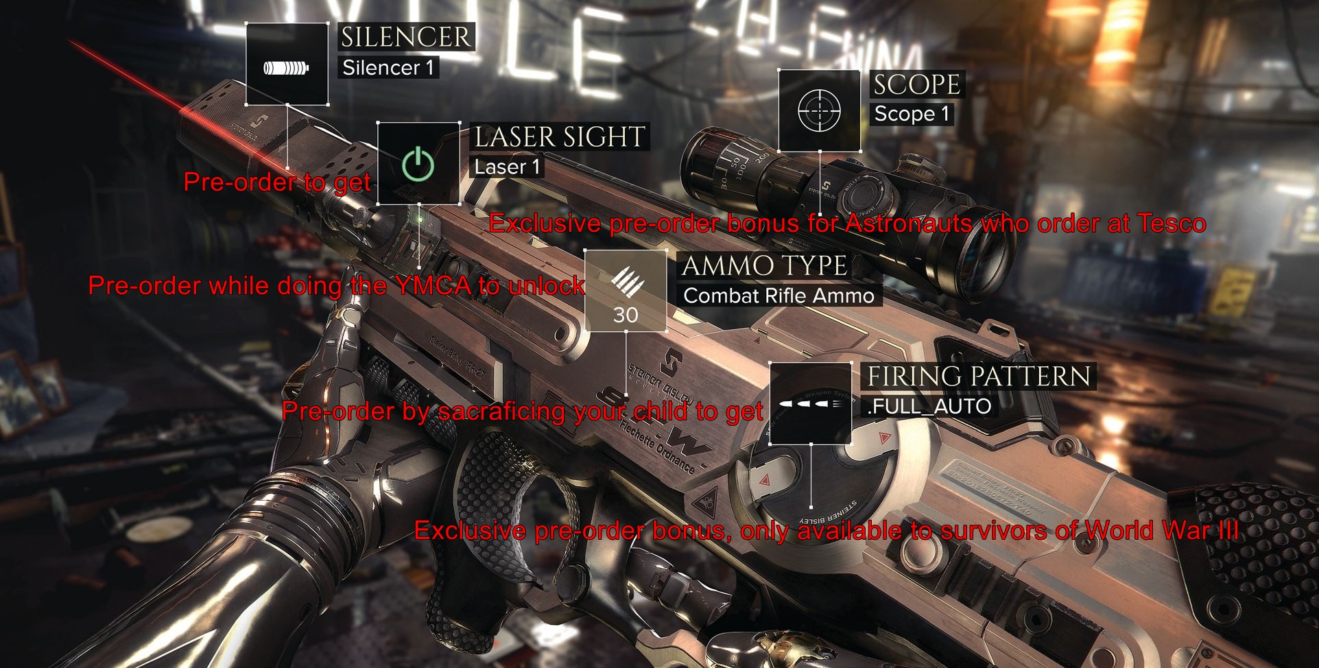 They also announced a fascinating but frankly disturbing pre-order system dubbed “Augment your Pre-order,” which combines pretty much everything bad about the current pre-order culture into a single, irritating idea. Pre-ordering is inherently anti-consumer, and has only become worse over the years with developers and publishers offering things like exclusive missions, meaning they’re essentially selling an incomplete product in order to get people to commit to purchasing something they really know very little about, or if it will even work properly at launch. The very act of pre-ordering alone, research has pointed out, makes you more likely to commit to going through with the transaction, and also more likely to search for positive feedback to reinforce your own decision.