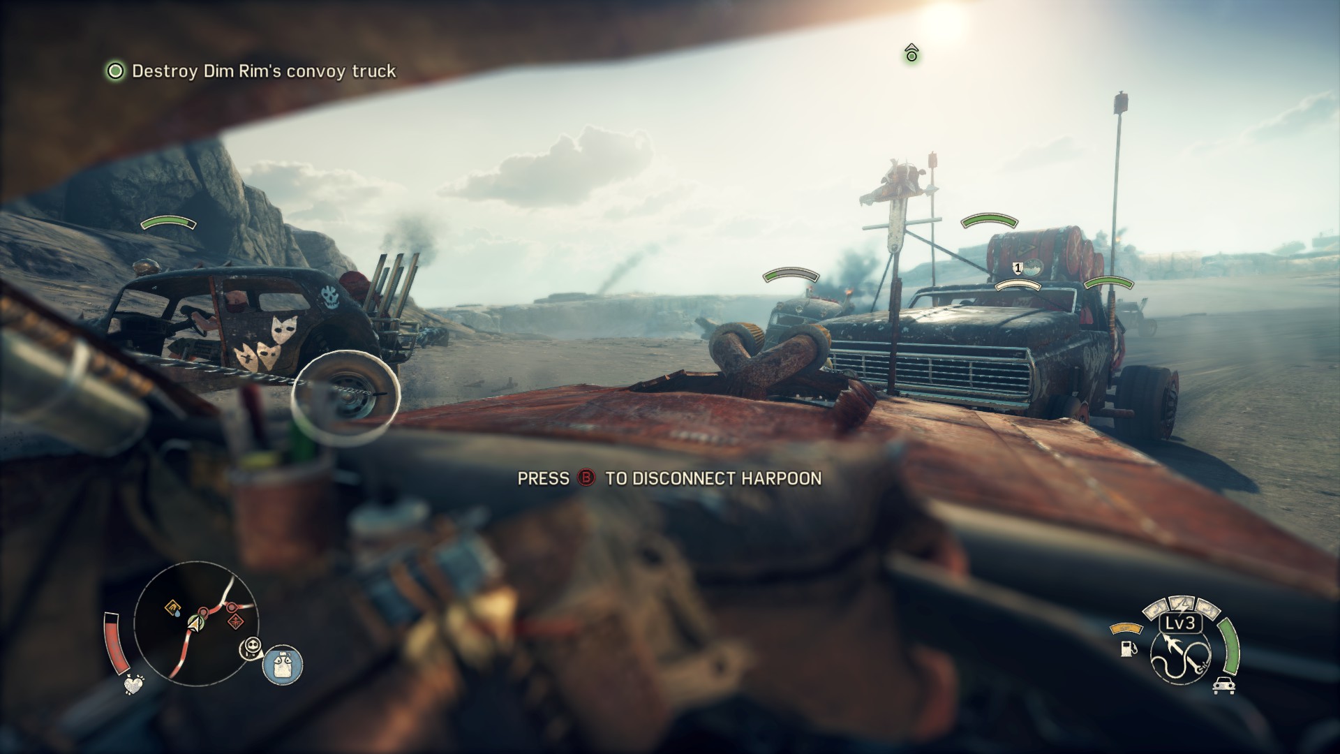Lowering the Threat Rating is a time-consuming process that clearly demonstrates the game’s clear love of tedious busy work, forcing you to take on camp after camp, pull down scarecrow after scarecrow, shoot sniper after sniper and battle convoy after convoy. Mad Max feels like it set out to deliberately tick every single box on the generic open world design list, even managing to replace the infamous Ubisoft towers that reveal the icon-littered map surrounding you, except this time the developer’s have somehow managed to make the concept more tedious. Hot Air balloons often need to have connecting wires broken which just means positioning the Magnum Opus and using the harpoon, or need to be refueled, which is as exciting as finding the nearby gas can and carrying it up a few ladders to the balloon. Once the balloon is actually read to go you have to hop in it and then wait for it to very slowly rise into the air, at which point you have to take out the binoculars and proceed to slowly scan the surrounding area so that locations will be marked on the map before then very slowly descending. Slowly. And then you can head off to tackle another camp, or rip down another scarecrow, or shoot another sniper. And then repeat. And repeat. And repeat.