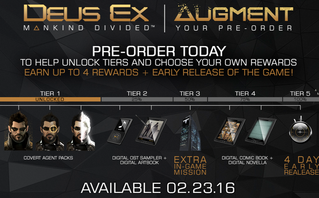 Essentially the system offered up pre-order tiers, with each tier containing different bonuses and only unlocking if enough people pre-ordered worldwide. If you pre-ordered the game you got the pick from one bonus per tier, meaning that if enough people pre-ordered you could get up to four bonuses, picking from such things as a digital art book or item pack. The fifth tier contained the biggest incentive of all; Deus Ex: Mankind Divided would release a full four days early.