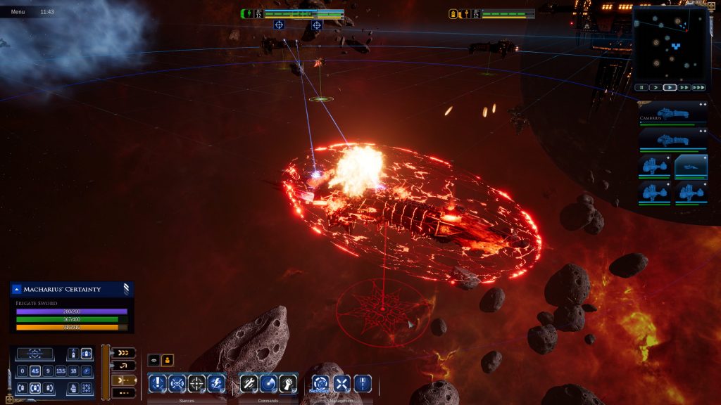 Like the original Battlefleet Gothic: Armada there’s a unique pace to the battles. The ships you control are massive, slow behemoths that take forever to turn and several ice ages to get anywhere. Yet somehow despite this the action feels tense, hectic and always engaging. You can simply click on an enemy ship to order an attack, but to get the most out of your ships you’ll constantly be looking for the best firing solutions, timing the launch of torpedoes for maximum damage, dropping mines in space or even just zooming into the action so you can watch the mayhem play out.