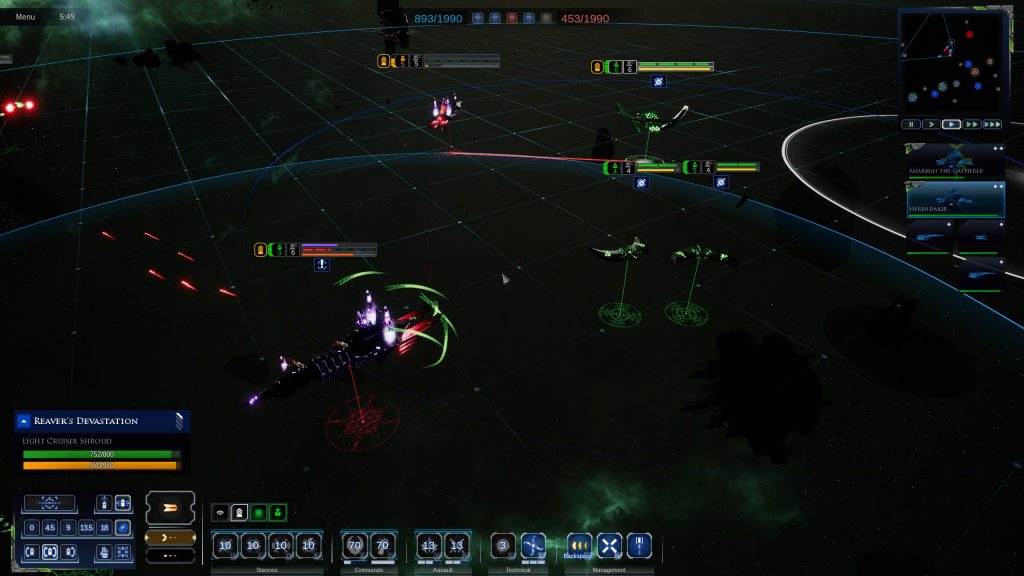 This time around we get three separate single-player campaigns that focus on the Imperium, the Necrons and the scary-ass Tyranids who field massive floating space creatures rather than ships. You can’t access these until you’ve gone through the prologue, though, which focuses on the Imperium and their massive warships. Out of the whopping twelve factions in the game the Imperium is the easiest to grasp, their massive ships capable of taking a pounding while dishing out plenty of damage.