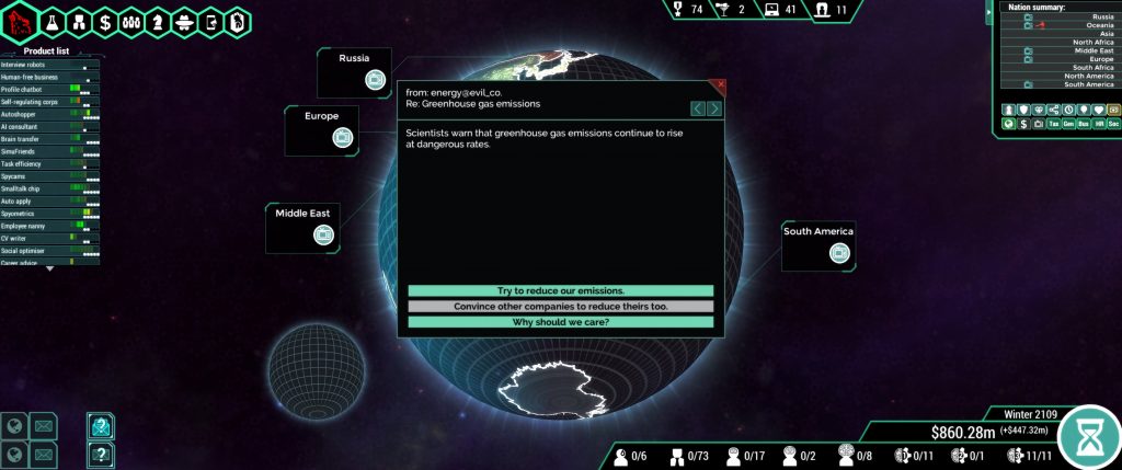 Then there’s the constant stream of little (or sometimes fairly big) events that pop up in your Email inbox. A lot of the messages you get are simply updates on laws that have been changed or perhaps a warning message from the board saying that they are losing confidence in your nefarious plans. However, many of the Emails you get offer up choices, some of which are fairly simple and others much more interesting. One potential storyline leads to you opening up an opportunity to develop rockets so that you can build on the moon. Other story lines including dating people who might struggle to reconcile your dubious business strategies with their own views, or the rise of terrifying smart A.I.