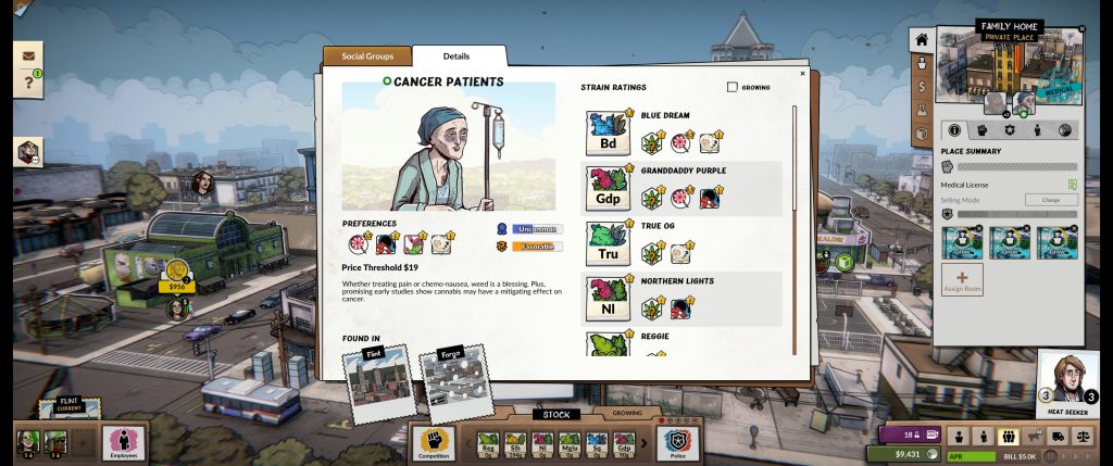 The downside to going down the entirely legal route is that it removes many of the more interesting elements from the game. The police no longer harass you, there’s less overall competition and you only sell to three types of patient. But happily Weedcraft Inc. does let you tread the line by selling legally and illegally, if you prefer.