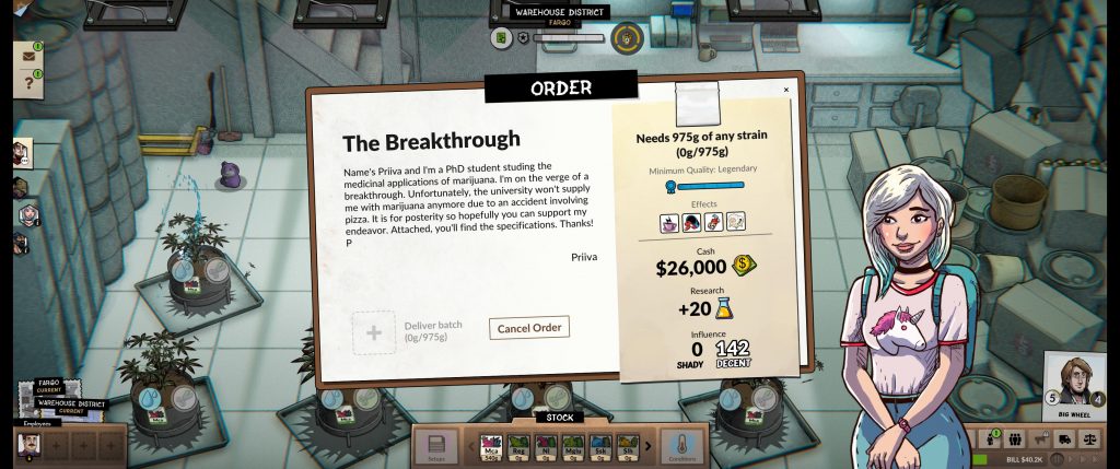 NPCs will sometimes pop up to offer you orders for specific strains of weed, plants with specific effects or just a massive quantity of the Devil’s Lettuce at a certain quality. These will typically offer you chunks of cash, research points and some experience for completing them. However, a lot of the time it’ll mean setting up a big grow room somewhere just for that order, to having to spend a bunch of research points on creating a new strain that has everything the order needs. I like these orders, and I enjoyed the very light story elements they bring with them.