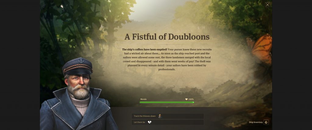 Okay, once the ship has been successfully shoved off into the big wide ocean it can be instantly forgotten about. For the most part it requires no oversight. That is, until the captain pops up on your screen with a predicament. Your vessel can come across numerous situations which will appear as chunks of text. Perhaps there are some pirates hunting the ship down, or maybe you’ve encountered a small village or whatever. You’ll be presented with a few choices on how to handle the issue. Depending on your ship and the gear you equipped it with certain choices will have a much higher chance of success. Regardless of how things play out after each event your crew will take a morale hit, simply due to the rigours of the expedition. If morale hits zero bad things will happen, so sending the ship home is always an option. But you can also use rations from the ship to massively reduce the morale hit.