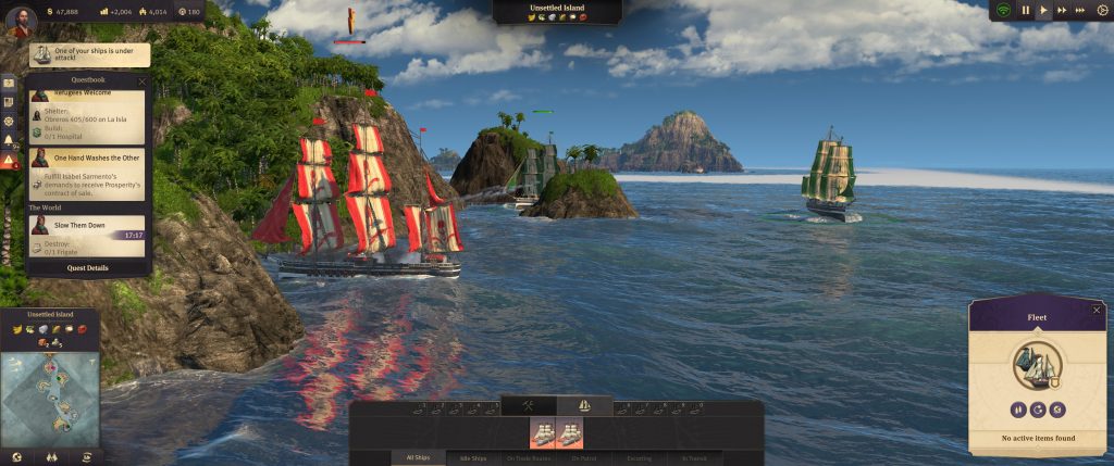 Speaking of optional stuff, you can pick up various quests along the way. A.I. players will occasionally offer you missions to escort their ships or deliver a crap-load of a specific resource like sails. Doing these typically nets you some extra cash, plus it’ll improve your relationship with the quest giver. Meanwhile, in settlements your people will occasionally ask for things like taking a picture of a wedding or finding five random alligators that are roaming the streets. Yes, that’s an actual thing that pops up.