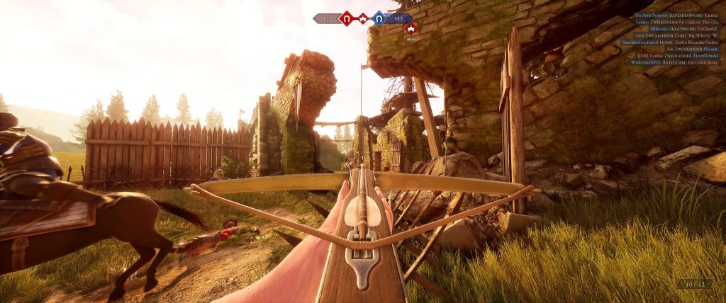 The prime example of how messy things can get is the newest map called Crossroads. There’s just a single central objective to fight for amidst a ruined fort, while outside is nothing but rolling fields where dozens of horsemen charge around. Horses are incredibly powerful in Mordhau, which makes the fact that both teams closest spawn points on Crossroads are in these fields. Spawning into the battle only to immediately get tramped to death. For the people attempting to fight for the objective this is nothing short of a horrendous design decision.