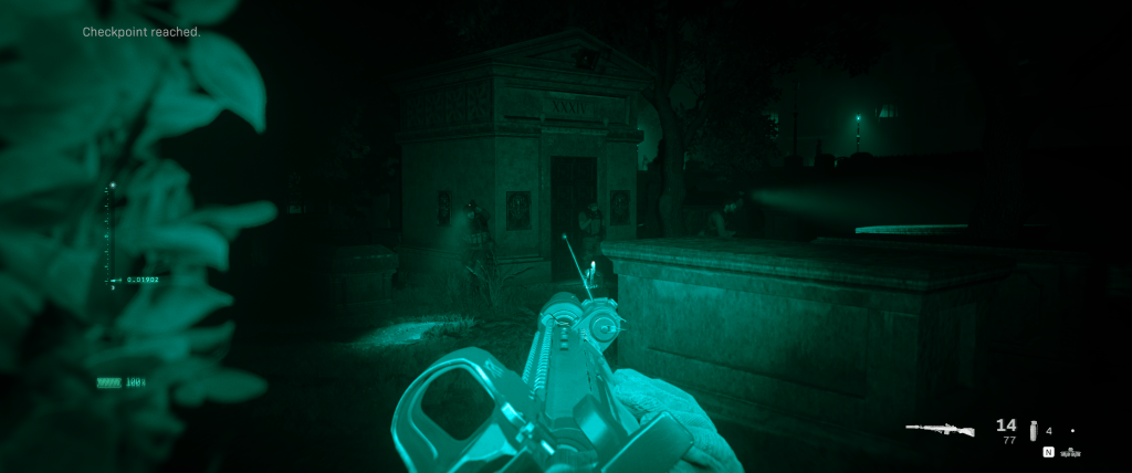Perhaps the biggest standout mission is called Going Dark which has you trying to locate an individual in quite a large area by Call of Duty standards. There are a few objectives and you can tackle them in whichever order you like. You can disable the power to buildings then proceed to shoot out all the lights before donning night vision goggles, because darkness in Modern Warfare is properly dark, as in you can’t see a fucking thing and thus night vision googles are a requirement. It’s a tense and immersive mission that deviates from the typical Call of Duty formula.