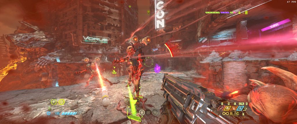 As for getting health there are med-packs to be picked up, but like Doom 2016 your best source of healing is to cause pain. Like before you can stagger an enemy by doing enough damage, then execute a gloriously gory Glory kill. The animations for these are amazingly detailed and revel in the sheer brutality of ripping limbs, stabbing demons in the eye with their own forearm bone and yanking out eyes.