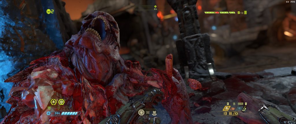 If you want to grab some armor that’s where your flame belch comes in, a recharging flamethrower that sets demons alight. Dealing damage or killing demonic dick-heads that are ablaze results in a shower of armor shards. Mind you, since the flamethrower is mapped to R by default I constantly found myself reflexively trying to reload and instead sending a burst of fire into the air. That’s not a criticism of the game, though, that’s just my own stupidity and years of muscle memory.