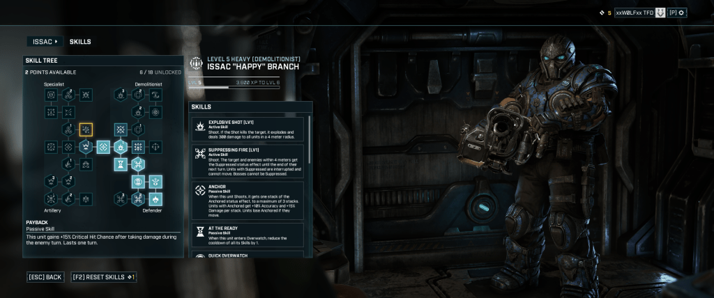 In total there are five classes and each of those has four skill trees to invest in that all offer very different variations. The result is a bunch of different possible builds, plenty of cool skills to use and a nice depth when it comes to figuring out the best combinations across your squad. The Support class is your all-rounder, armed with the iconic Lancer. They can buff team-mates and provide healing on the field. The Vanguard gets a retro lancer that dishes out heftier damage at the expense of accuracy, and can bayonet charge enemies. Standout skills include Intimidate, which throws nearby foes out of cover and breaks their Overwatch. The Scout class is armed with a Gnasher shotgun, and can do things like cloak. The Sniper is exactly what you would imagine, but with the right build can recoup action points on successful shots and kills. Finally, the Heavy wields a Mulcher machine gun, and is probably the class I found the least useful of the bunch, but maybe I didn’t find the right spec.
