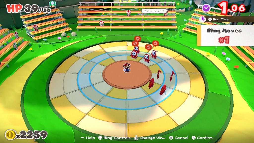 It’s the combat system where I have some doubts. In the boss fights it’s excellent. You rotate and slide concentric rings in order to line up directional arrows so that Mario can move to the boss, and finish up the route with an attack or ability icon so that you can dish out some damage. It’s a really cool puzzle as you get a set amount of moves you can make, and each boss battle comes with fun twists. However, when it comes to battling regular enemies it isn’t as good. With normal foes Mario is in the middle of the concentric rings, and you get a specific amount of moves to either line foes up in a line or gather them in a 2×2 square. If you manage it you get a boost to attack power. At first, it’s a pleasing puzzle, but after just a few hours I was really tired of it. Each battle felt the same with nothing new being added to the mix. I’m about 5-hours in though, so there’s plenty of time for it to evolve and change, or for the game to give me ways to avoid or skip these fights.