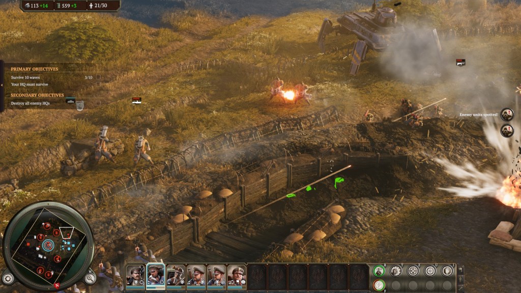 The online side of an RTS can be a horrifying and nerve-wracking place to venture for newer players or even those who just don’t feel like they have much skill in the genre. A good A.I. is vital, then, so that people can build up their skills. Again, Iron Harvest disappoints a bit. Enemy A.I. doesn’t seem concerned with flanking, and will often run into a hail of bullets so it can take cover on the opposite side of a wall from your own soldiers. Pathing seems to be off with half a squad sometimes going in a completely different direction to reach the same destination. Engineers are especially bad about this when building barbed wire fences. Half the squad will end up on the other side of the fence and then have to run around the whole damn map to get back to safety. And I’d frequently jump back to a fight to find a squad of infantry just standing there while an enemy squad is shooting at them. In other words, the A.I. needs work and is susceptible to early game rushes.