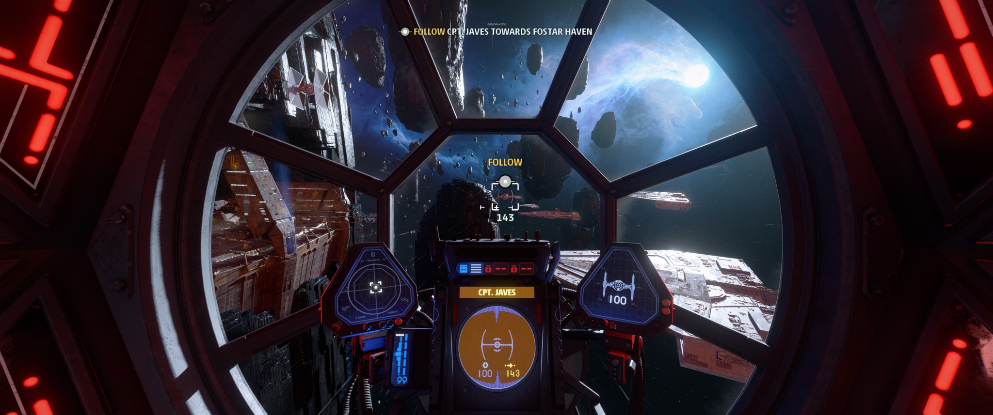 Despite focusing on arcade thrills, Star Wars: Squadrons takes place purely from a first-person viewpoint. You’re always packed into the cockpit as you weave through asteroids or chase down a starfighter. Perhaps for some people, this strict first-person camera will be a major turn-off, but for me, it’s a good choice. It’s immersive, and if you want you can switch off all the gamey HUD elements and just use the fully working instruments in the ship’s cockpit to fly with.