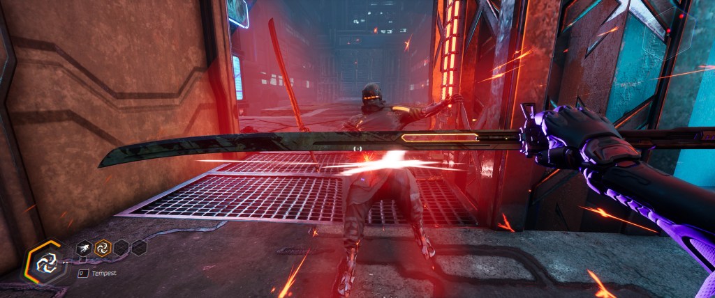 You do get your metal hands on some extra powers, specifically four of ’em. There’s Blink, which lets you slice through multiple foes in a line while also ignoring projectiles. For something a little Jedi-ish there’s Tempest, a surge of energy that blasts out of your hand. The other two I won’t chat about, but suffice to say they all add a little extra zest to gameplay, and their use is controlled by a meter that builds up slowly or by killing enemies. The system is nicely balanced so that you can’t just spam abilities (although hiding like a pussy until they recharge is doable) and so their usage feels important.