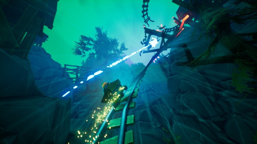 Aside from the platforming and the massacring of anything in the way, there are a couple of other things thrown into the mix. Each level typically contains an on-rail segment that feels so much something ripped straight out of the Playstation 2 era that I briefly thought I’d travelled back in time and was going to wind up accidentally flirting with my mum or something. You’ll ride on minecarts, a spooky horse and more, using the jump button and your crow companion to break objects. These sections are fun at first, but I did find that having them pop up every level was a bit much.