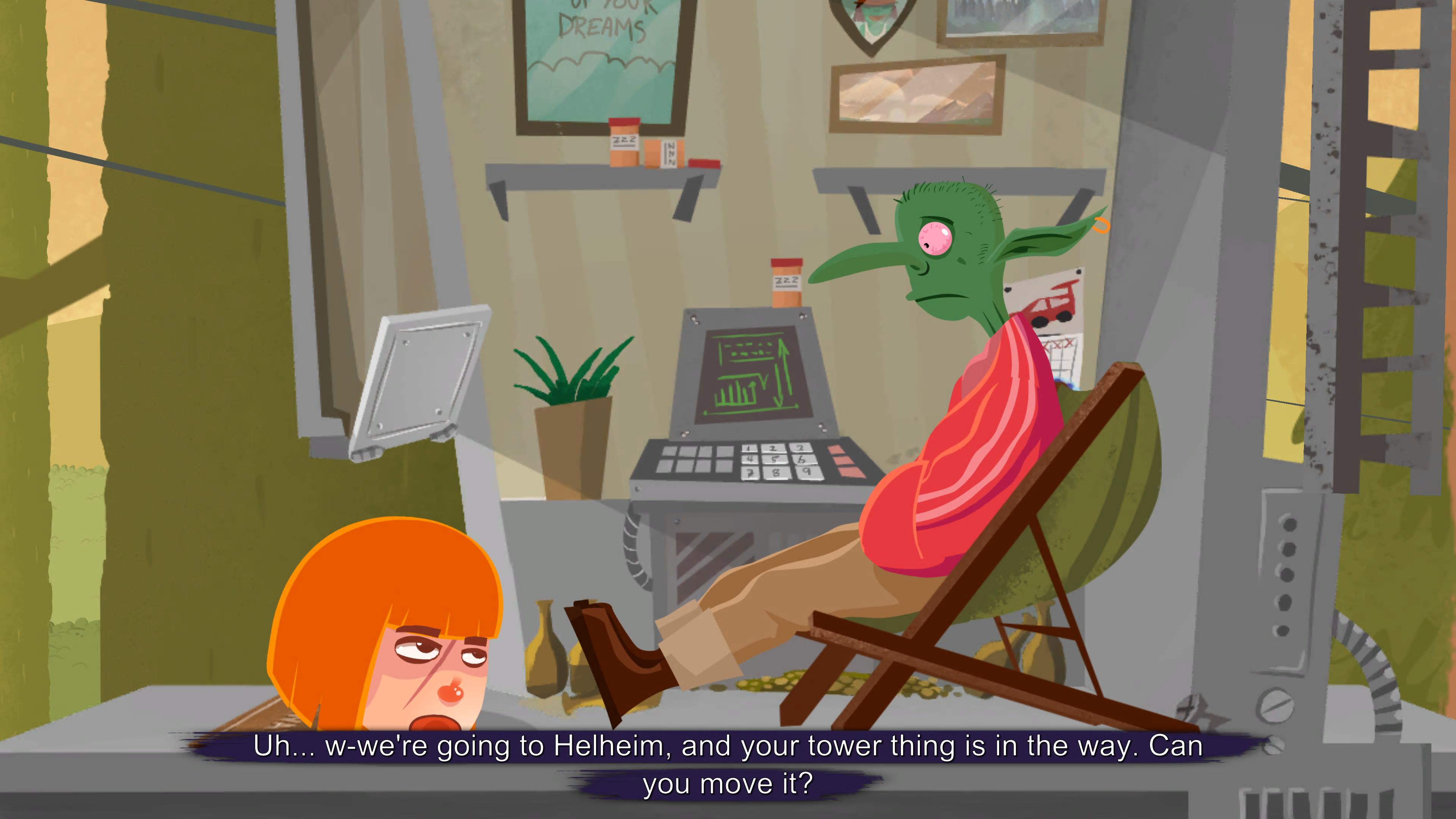 Still, I enjoyed the rest of the gameplay, though it isn’t the most satisfying or fun puzzler around. Just yanking off my arms and combining them into the ultimate monkey-bar machine is hilarious. But it’s the story and zany characters that make the journey to Helheim worth it. The eclectic cast of nutjobs are an entertaining bunch and the acting is surprisingly strong throughout the whole game, and the writing is sharper than Odin’s moustache. There’s a mixture of Norse and Christian mythology with famous characters being wildly reimagined to fit into the crazy world of Helheim Hassle. And then there’s the layers of references to other games, movies and pop-culture, the kind that can so often feel lazy if not used right but that are deployed brilliantly in Helheim Hassle. There’s even fun jokes that pop up when you skip dialogue, making a potential replay more interesting.