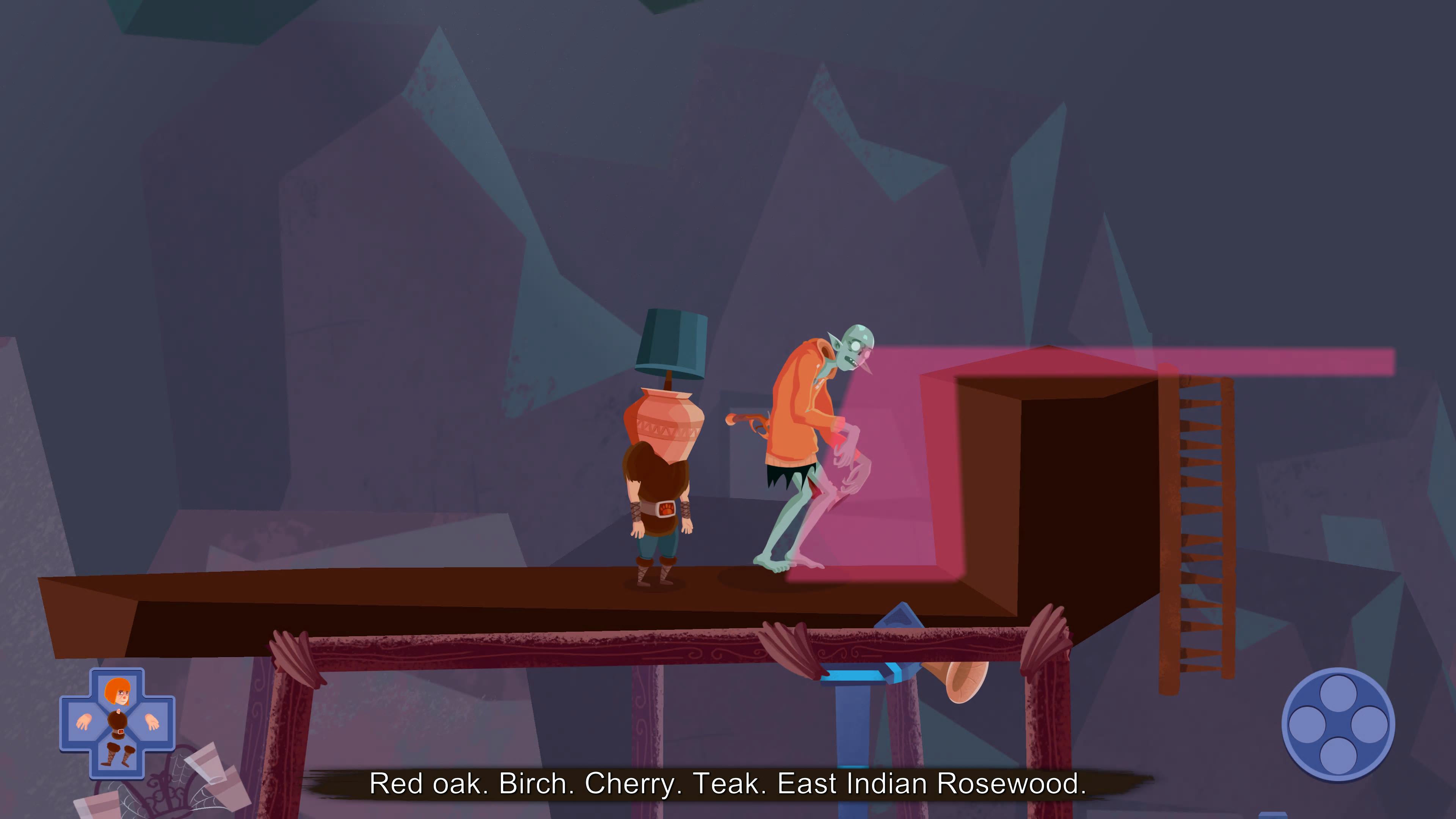 Bjørn has a bit of an advantage when it comes to solving the various conundrums conjured up by the Goblins, though; he can detach his head and limbs and control them individually, or even combine them in a variety of freaky ways. You can hurl your head into a platform or combine an arm and a leg into something that can jump and climb with ease. Most of the puzzles, then, involve standing on switches or pulling levers while figuring out what combinations of limbs to use. A fairly early puzzle, for example, involves a bunch of muscular demon things who are lifting weights. By using your arm you can tickle them, causing them to drop their weights, while your head can shout encouragement so that they put in extra effort and life their weight. As you tickle and chat, you move the rest of your body through the environment as routes open up. And Helheim Hassle does a good job of tweaking its mechanics as you go, adding new concepts that keep it interesting. You might roll your head around in the snow to form a massive snowball, or avoid furniture-loving Draug by using your legs to move a wardrobe around. Another interesting twist later involves donning a robot head so you can see the otherwise invisible laser walls.