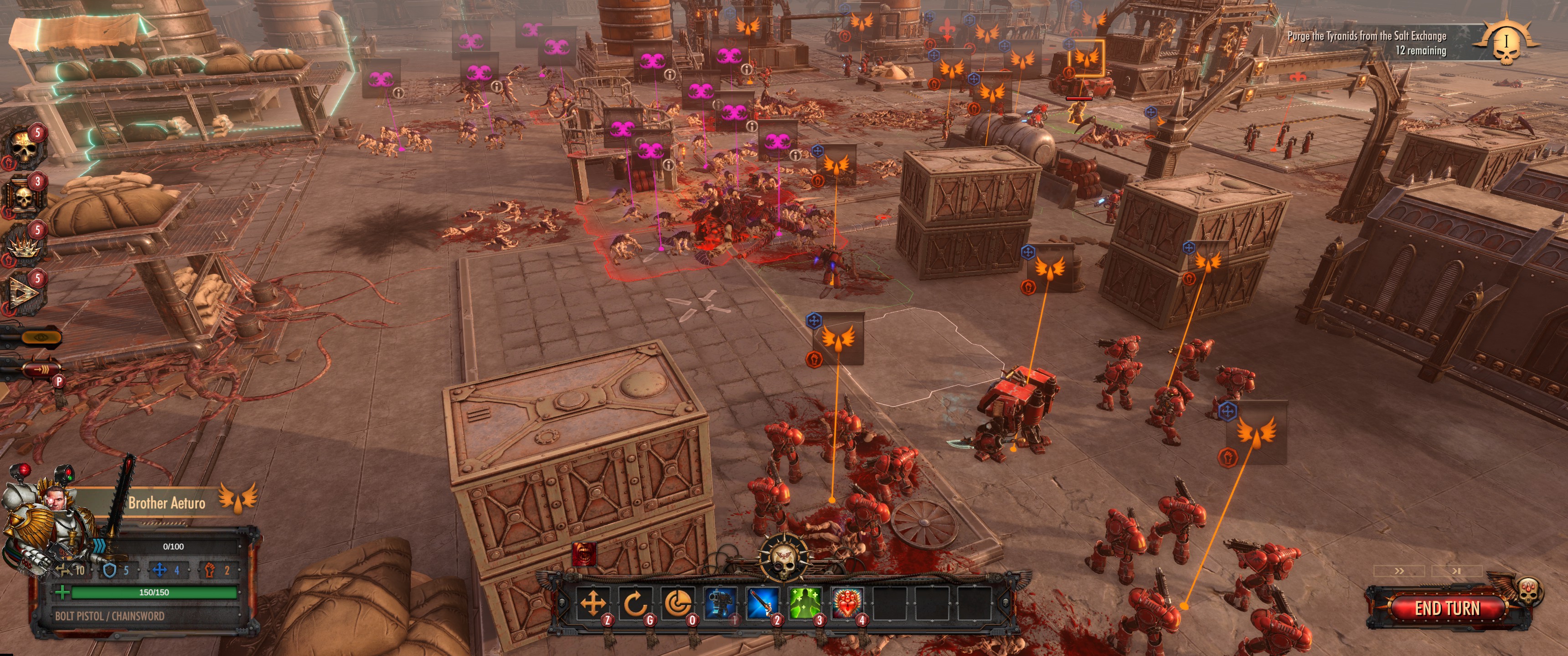 Skirmish mode holds the allure of potentially becoming a playground if the developers create more factions. Right now, you can place as either the Space Marines or the Tyranids across 8 maps. You can set up turn limits, a point cap for armies and so on. It’s fun, but I can’t help think of how good it could be in the future with races like the Imperial Guard. Still, it’s awesome to get a break from playing as the Blood Angels, and the Tyranids feel completely different to play as. Their swarm tactics and big, expensive units are a lot of fun to mess about with.
