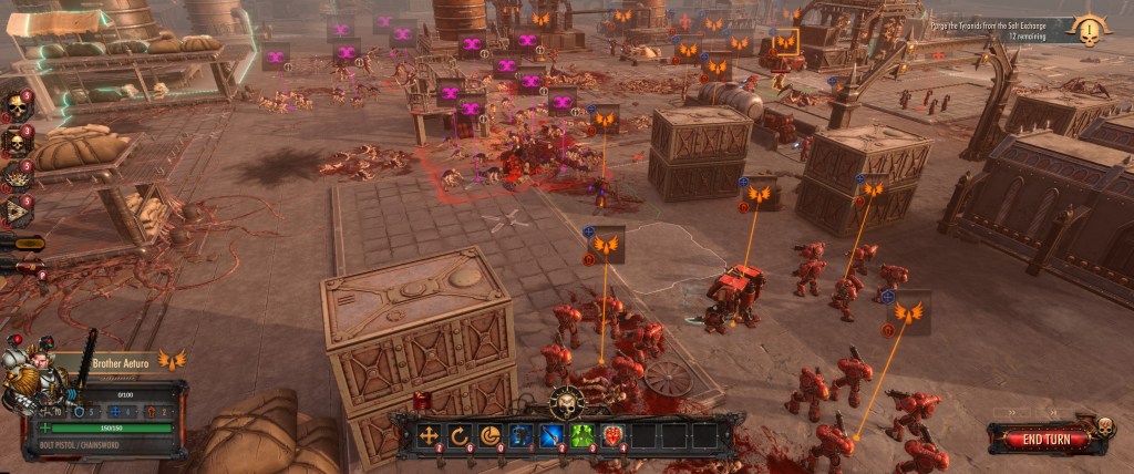 It’s not unusual to be dealing with 30+ enemy units on the map, all scampering around and trying to rip heads off. It’s a sight to behold, but it does also mean that even when using fast forward enemy turns can take a while. When it’s the players, multiple units can move and even attack at the same time, cutting down on the time spent watching Blood Angels stomping across the battlefield. The Tyranid forces, though, don’t do that, so you have to watch them all shifting around one by one. Even using the skip button, which cuts out enemy movement and just leaves the attacks, there were some turns when I couldn’t help but let out a sigh. But that’s the nature of these games, so it’s hard to be too annoyed by it.
