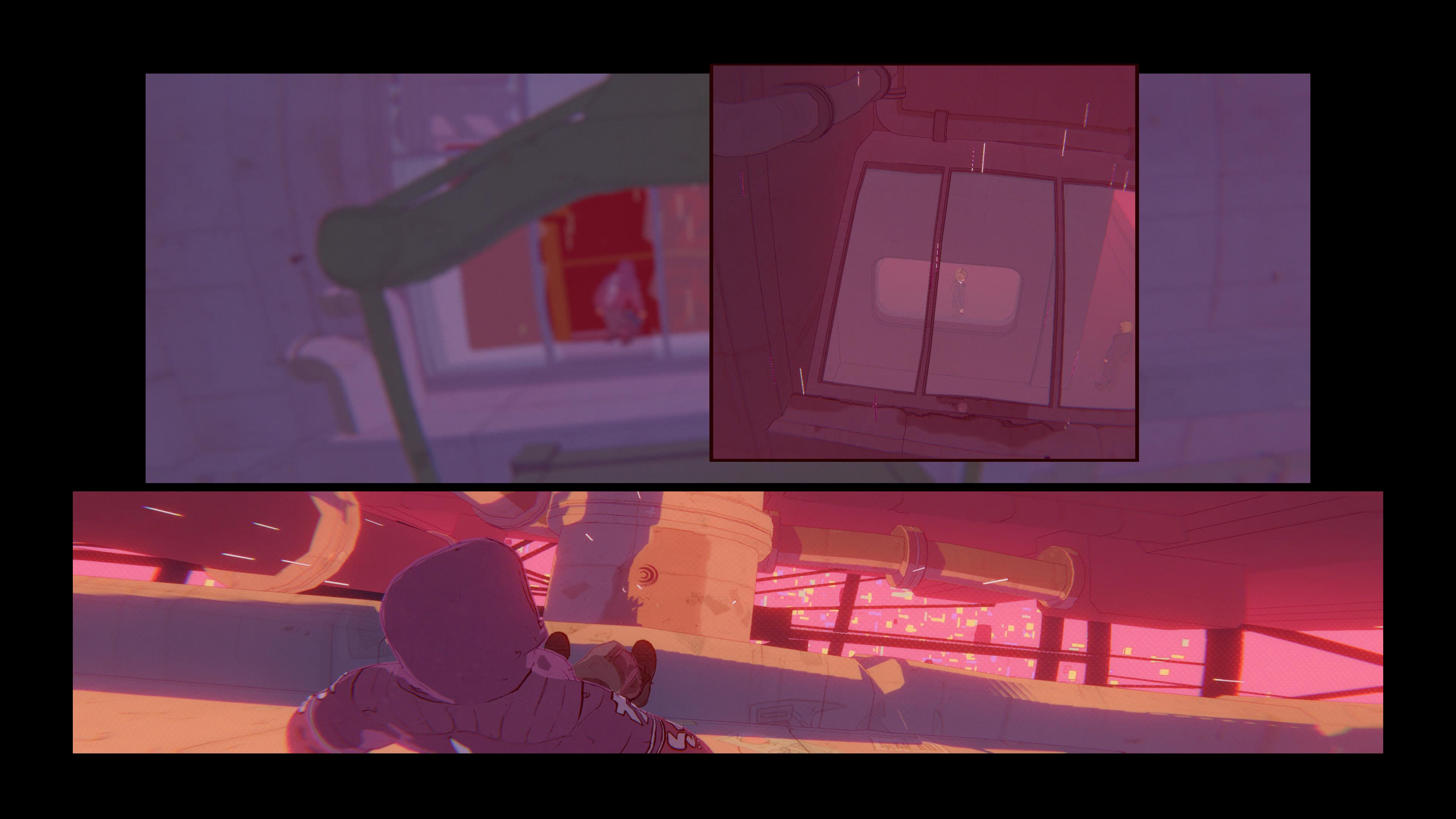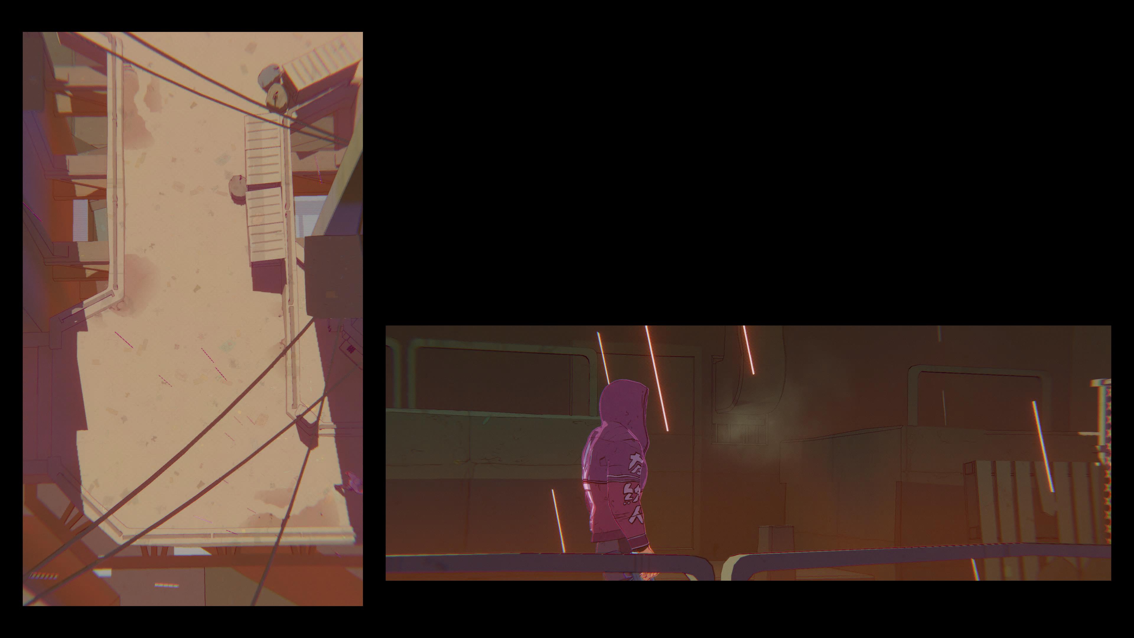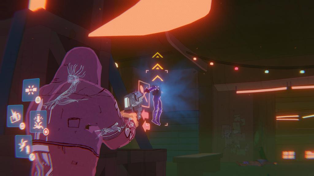 No doubt, Foreclosed makes a damn good first impression thanks to its intriguing visual style. Typically the cyberpunk genre favours grime and dark colours, but Foreclosed uses what I’d describe as almost pastel colours in a heavily stylized look that the developers say was inspired by graphic novels and comics. Sticking with that theme, the game uses a lot of comic book panels to tell its story, often swapping viewpoints as you move around. At one point the comic book panels show your target coming down in an elevator while you continue playing the game in the other panel, fighting toward the elevator doors.