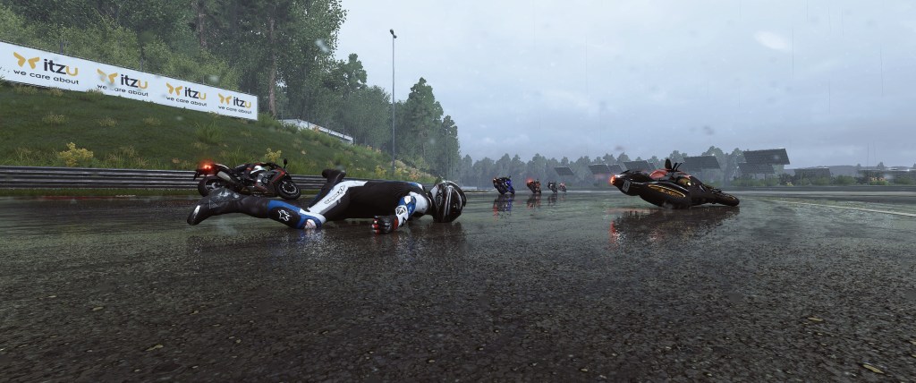 I could talk for thousands of words about every little aspect of the handling and still not provide a good idea of exactly what works and what doesn’t, so instead let me wrap it up in broader terms: The bikes feel powerful, the handling feels satisfyingly balanced between realism and forgiving. It can be brutal at times, especially for newcomers, because while RiMS machines are much tamer than their real-world counterparts, it still doesn’t take much to kick that back wheel out or completely overshoot a braking point and go careening into the gravel like a rocket. Sure, there are things I don’t like, such as how slow the bike goes from one left-to-right or right-to-left or how the foot pegs constantly grind on the ground, but in general I liked the handling and the feedback, and I loved the feeling of nailing a corner with the rear wheel spinning up, even if the physics system seems to want to keep both wheels. You have to let me Casey Stoner those corners, RiMS.