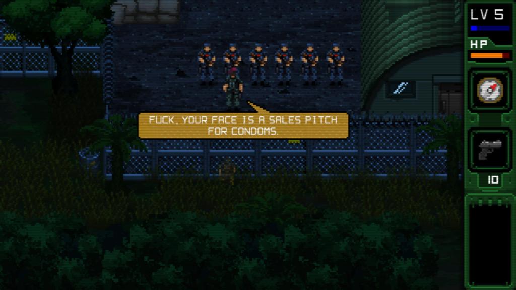 Set within the drab concrete halls of a military facility and the greenery of the surrounding jungle, UnMetal isn’t much of a looker. The classic pixelated style is implemented well, even if I do think it’s getting overused these days, but the environments and just about everything else are…well, kind of dull. A little more flair for the character designs or a bit more detail in the environments would have gone a long way.
