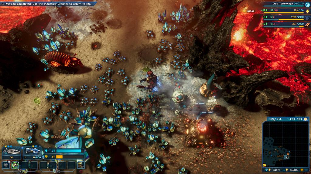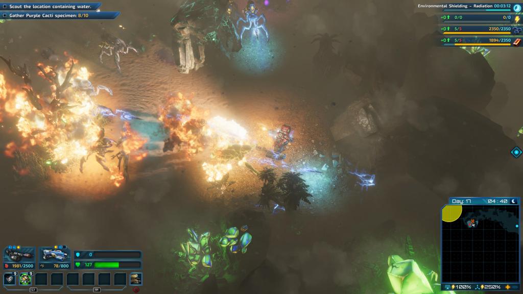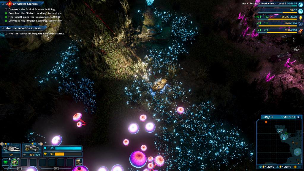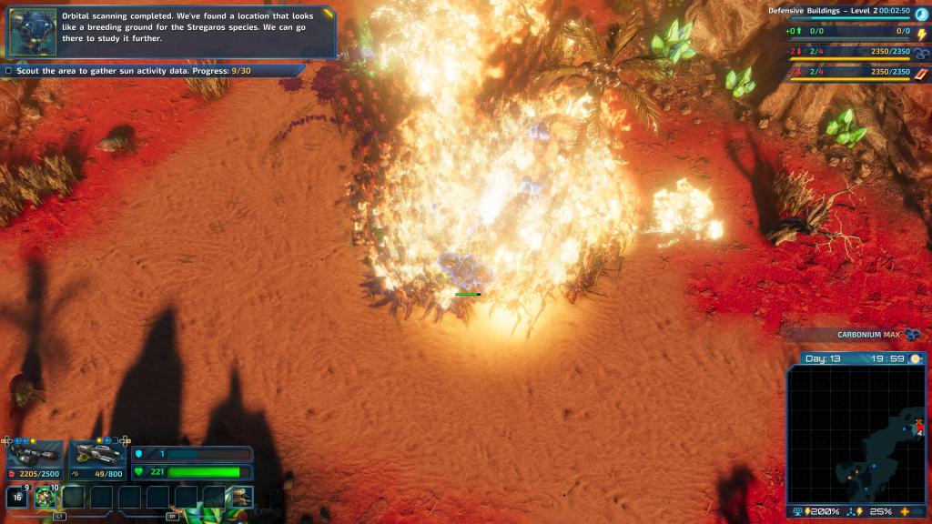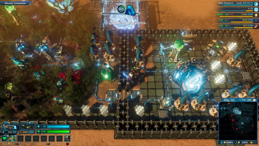 There are plenty of resources on this alien planet but they tend to be spread out. And while you’re base might be relatively safe and cosy and has the best hot chocolate in the galaxy, at some point the initial sources of Carbon and Iron are going to begin running low, forcing you to open the gates and venture out. This is the crux of the game, judging how far to spread yourself and how fast to expand. As you go farther afield to acquire resources your mines have to become little outposts with their own power and light defences. Me, I spent too long feeling lost in about 6-hours in which resulted in some resources being drained and me fighting a battle to maintain numerous distant mines while also trying to advance the mission.