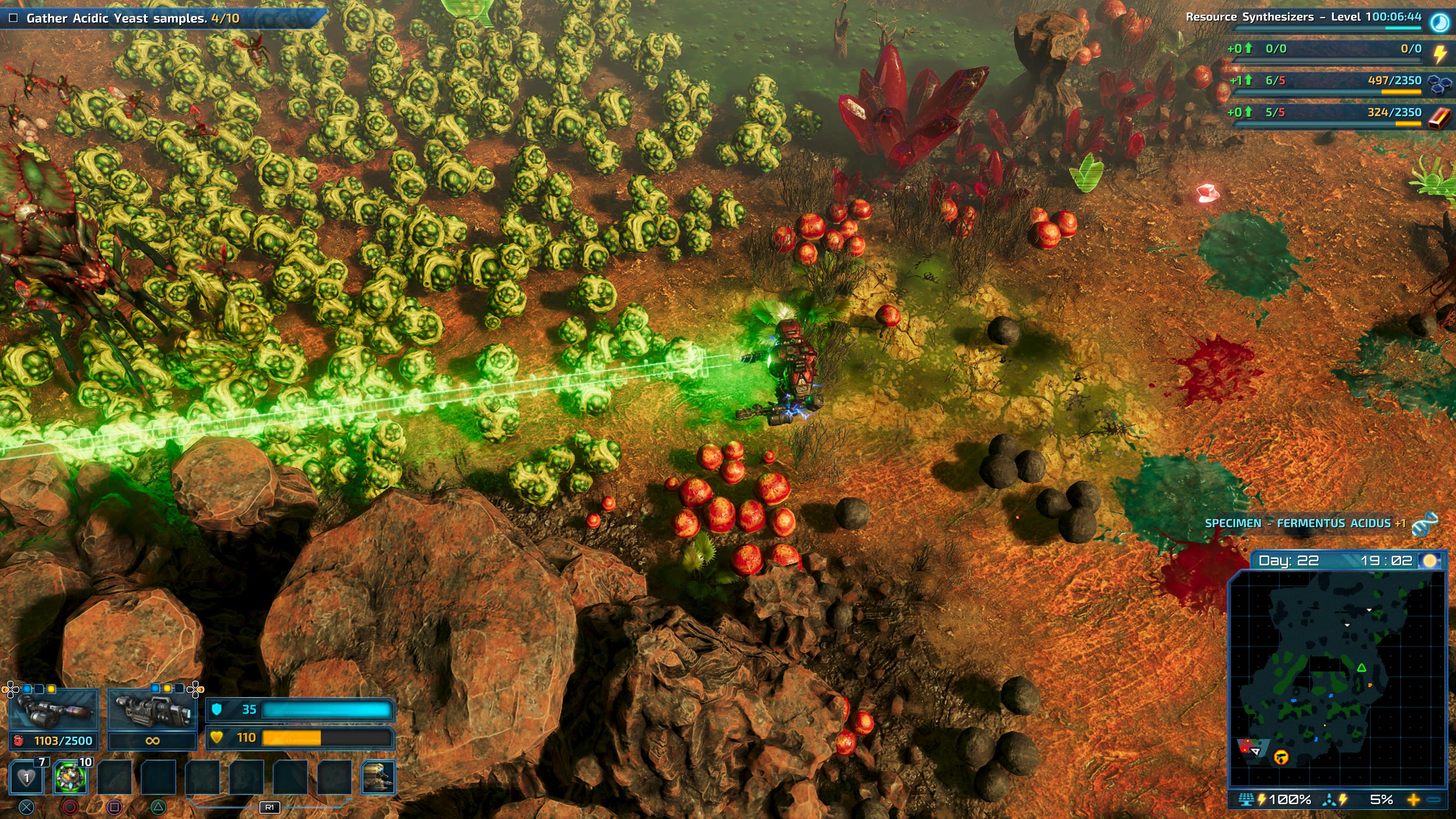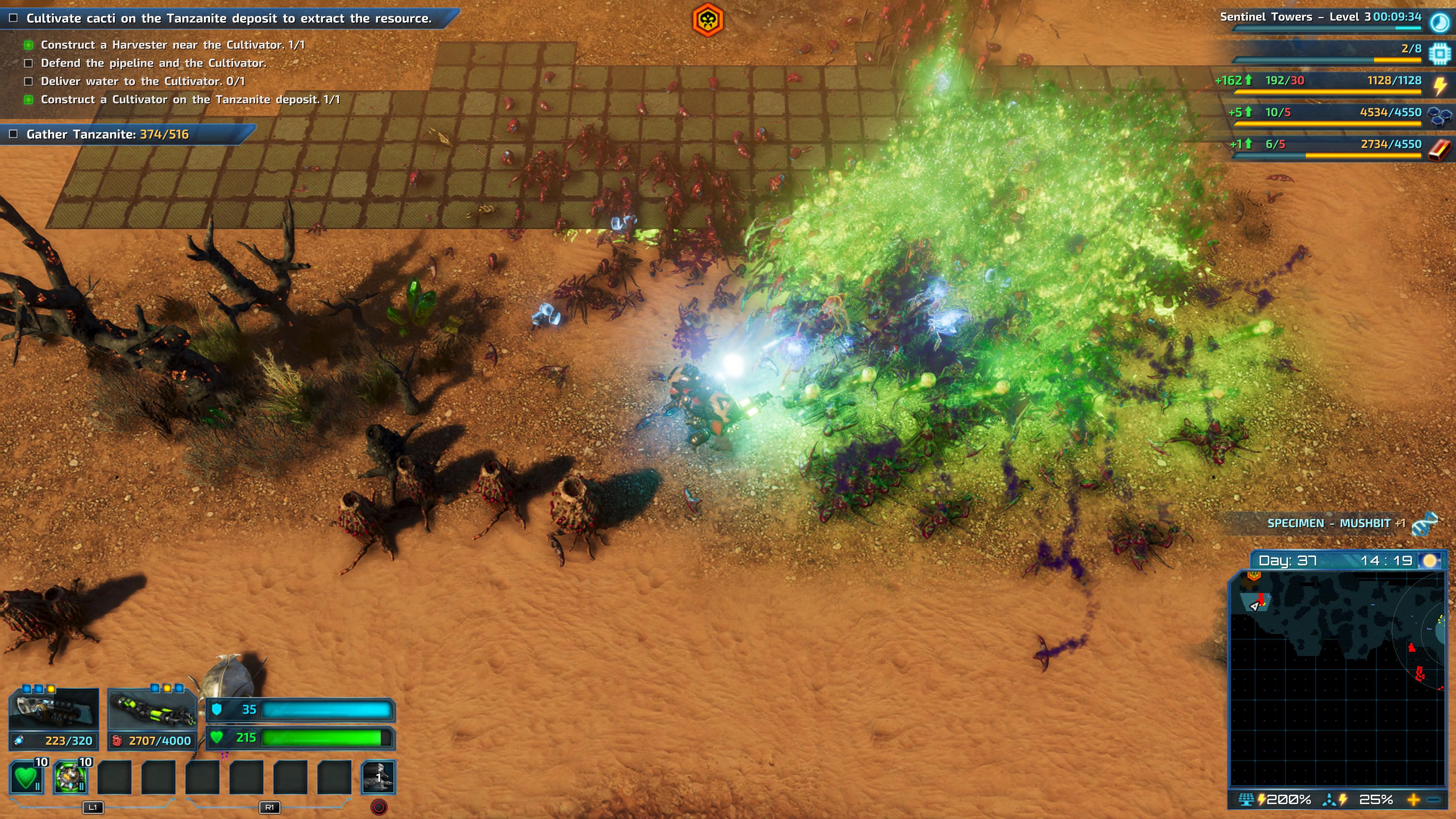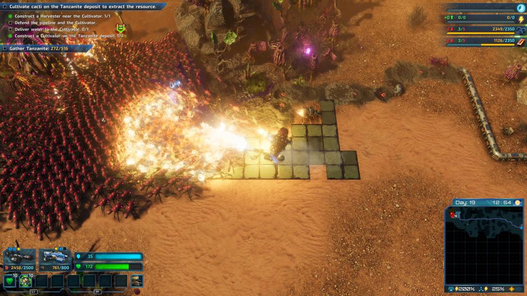 I did find this portion of the game to be a slog after a while. The Riftbreaker tries to make each new randomised segment of the planet interesting via little twists – high radiation or an acid plant that grows at insane speeds, but those only mean researching a couple of specific things. Outside of that, you mostly go through the motions of building another base, albeit on a smaller scale. Sometimes it’s fun, and sometimes it’s the Tanzanite mission which quickly became of my most hated gaming experiences of the last year. It sees players trying to build up a water pipeline, plant cultivator and harvester while coming under constant assault from hordes of tiny bugs, while also dealing with consistent natural disasters. The key is to build up a heavily defended outpost at both ends before trying to lay down the pipeline, but it’s still an incredibly frustrating objective as every step of progress gets obliterated.