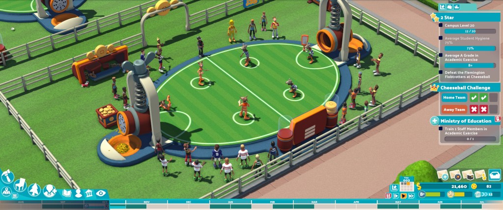 There are a few annoyances that have carried over from Two Point Hospital, specifically in the A.I. It’s infuriating to watch a student’s happiness crashing because they’re bursting for the toilet and need a wash but refuse to walk across campus to use the toilets. It all comes down to understanding the systems behind the game and remembering that the game’s people don’t behave like real humans. To you or me it might seem simple to go for a toilet break, but for the game is telling them there isn’t enough time in the schedule to walk across campus to the bathrooms and so they’ll simply continue to exist in some sort of pee-related Hellscape. The remedy involves spreading smaller bathrooms across every building so that staff and students alike have time to attend to the necessities. Even then, though, some students will be remarkably belligerent when it comes to looking after themselves.
