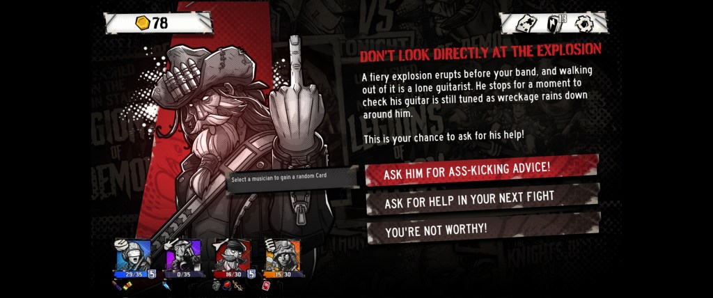 Speaking of which, one of your crew visiting the great big music store in the sky isn’t game over, they’ll just be out of the game until you visit a health stop on the map and resurrect them. Until then, though, you’ll have to bust skulls with less backup, and you’ll have a bunch of bad cards chucked into your deck for every band member missing the gig.