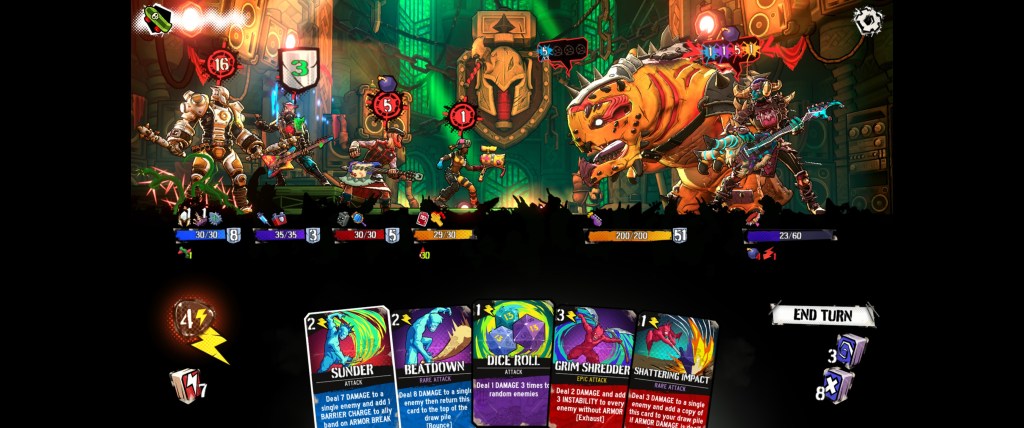 And speaking of which, the boss battles are pretty lacklustre. They’re big bruisers with equally big health bars and armour, and their fights are little more than slow grinds without too much thought required. They’ll throw out big damage that often affects your entire band, too, so you buff up your armour, throw out whatever damage you can and just hope that the cards you’ve picked up along the way will let you grind down their health bar before they grind down yours.