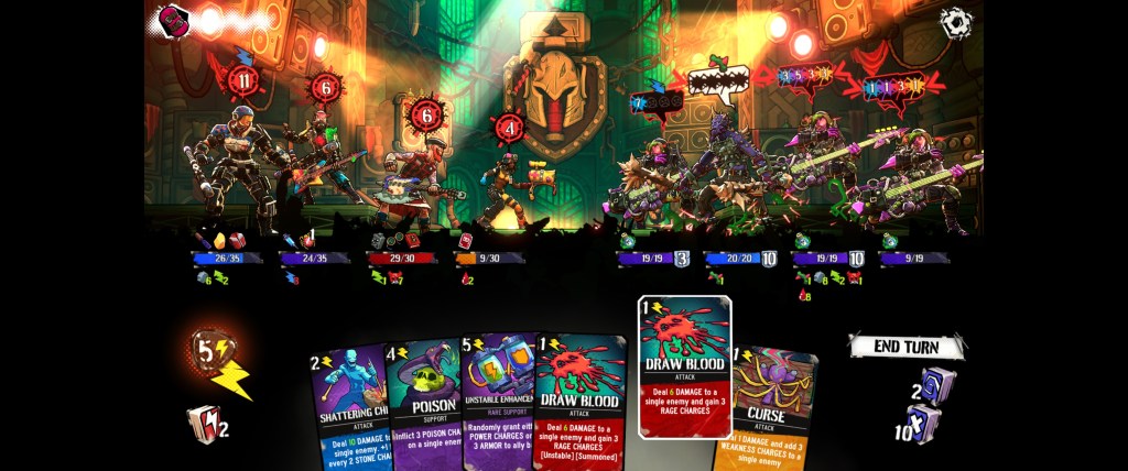 Each turn you get an amount of energy to spend on playing cards from your hand, so naturally, it’s all about figuring out the order of play to get the absolute most from the selection because they all get dumped at the end of the turn. On the other side of the screen, there are speech bubbles above the enemy band showing what they’ll be doing on their turn, with damage indicators above your bandmates displaying just how fucked up they’ll be getting. And I don’t just mean at the backstage party. By keeping a wary eye on that info you can decide to focus down on one enemy before they turn your drummer into a drumskin. If you can’t kill them outright, breaking their armour stuns them for a turn, potentially saving a bandmate from being downed.