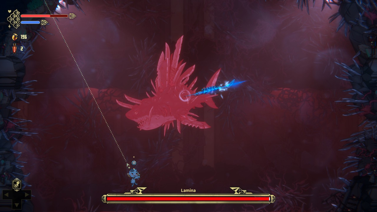 In true Metroidvania fashion, the map is a sprawling web of rooms, corridors, shortcuts and discoveries. The story does provide some general direction but how you get there is the meat of the game. Many chunks of the map will need new abilities to access, so you go off on an adventure to find an upgrade and wind up battling one of the cool bosses, like a massive shark whose hide is pierced with hundreds of huge blades. Although Pronty doesn’t break any new ground, the execution of its classic Metroidvania design is excellent. Everything comes at a nice pace, the layout isn’t overly complex but has heaps of room to get lost and explore, and it’s satisfying to finally reach your goal after spending 15 minutes swimming around, looking for the way forward.