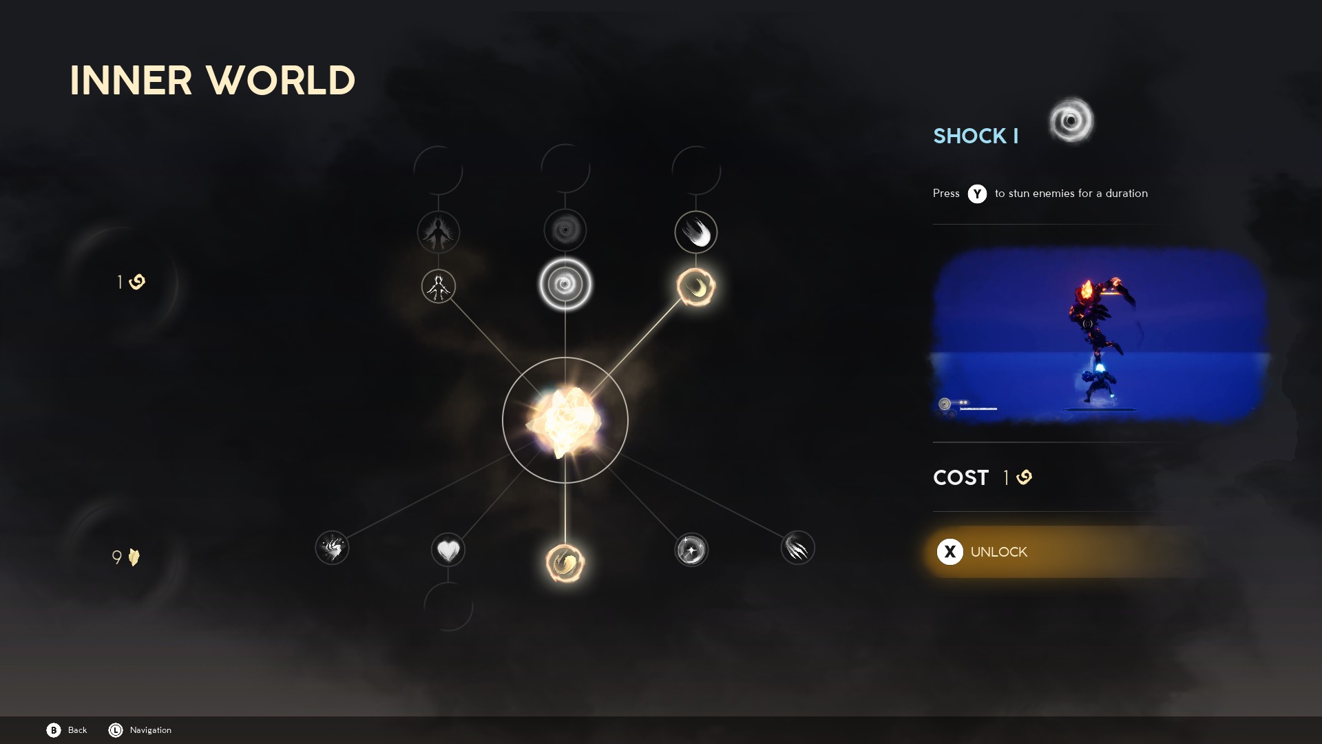 Along the way, there’s a very lightweight upgrade tree for you to explore. Each enemy drops a small orb of light, encouraging you to engage enemies you could otherwise trundle past, and more can be found scattered around the environments, usually squirreled away in very obvious spots. By visiting your inner mindscape you can spend these on increasing base health, a more damaging counterattack that can be used if you successfully parry every attack in a chain and a few more. The bigger upgrades come when you defeat the bosses, enabling you to unlock and invest in the combat abilities I mentioned earlier.