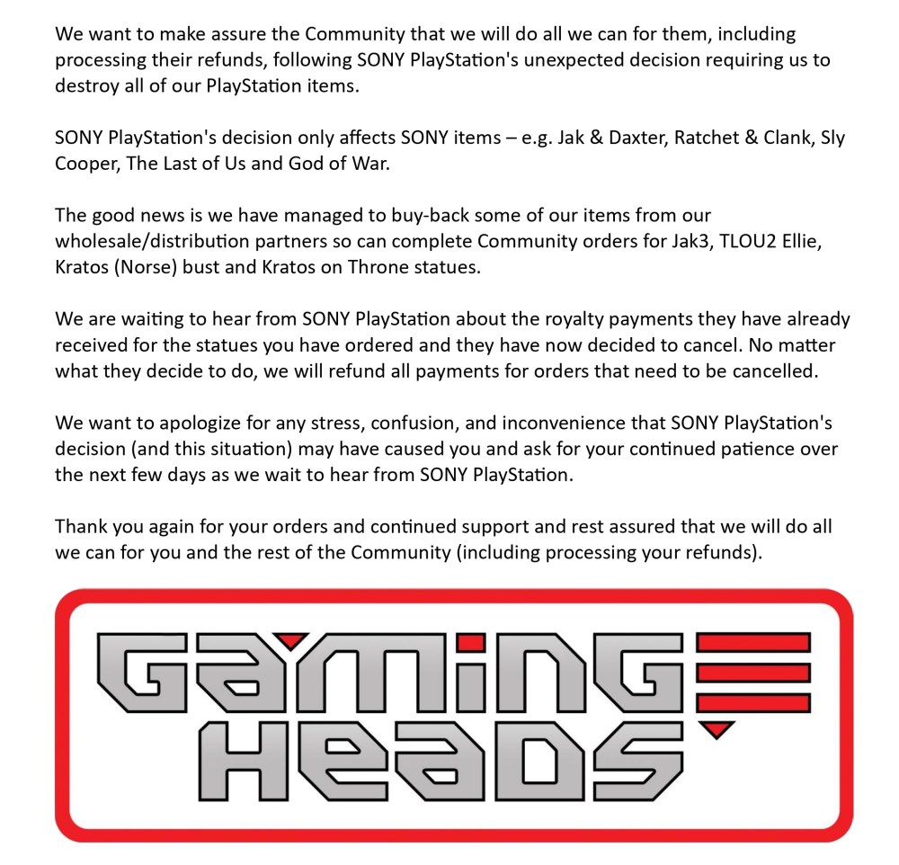 Gaming Heads also say they are waiting to hear from Sony regarding royalty payments for items customers had already ordered but Sony had cancelled. Again, this seems somewhat at odds with their words about buying back statues and completing orders.