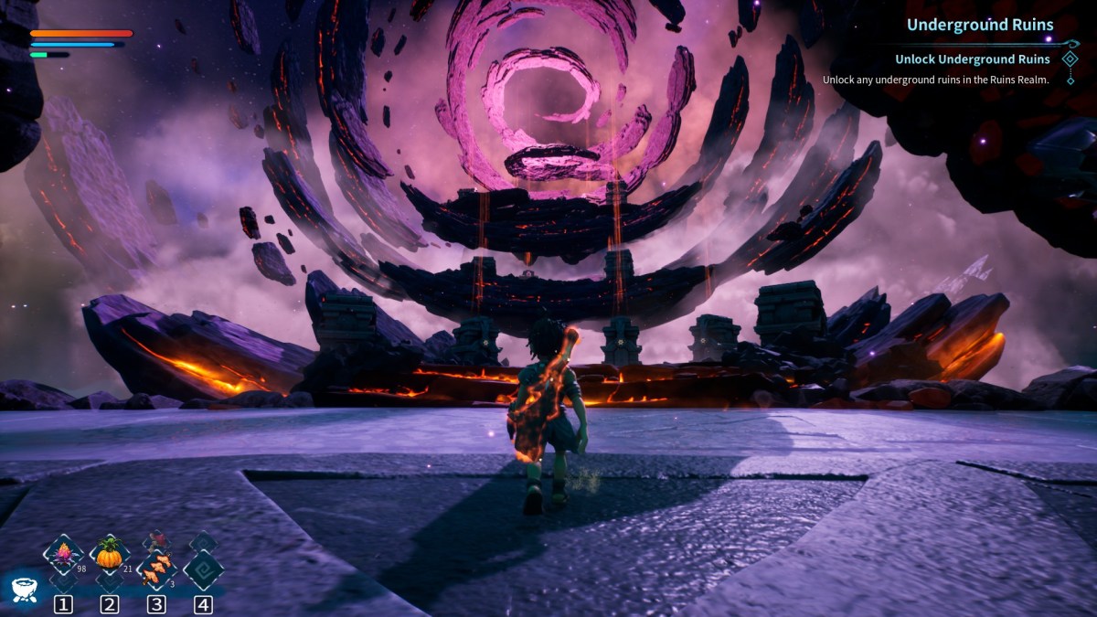 Levelling up Kaku to tackle stronger enemies isn’t handled through menus but rather venturing into a strange set of underground runes via a portal you can open up at any time. From there you can spend special crystals and resources to level up your basic defence and damage, as well as unlock new special moves. Improving health and stamina is slightly odder though, as you have to use special Ruin Keys to open up small platforming and combat challenges. As you complete challenges you’ll move up to the next floor where the doors cost more keys to open and so on.