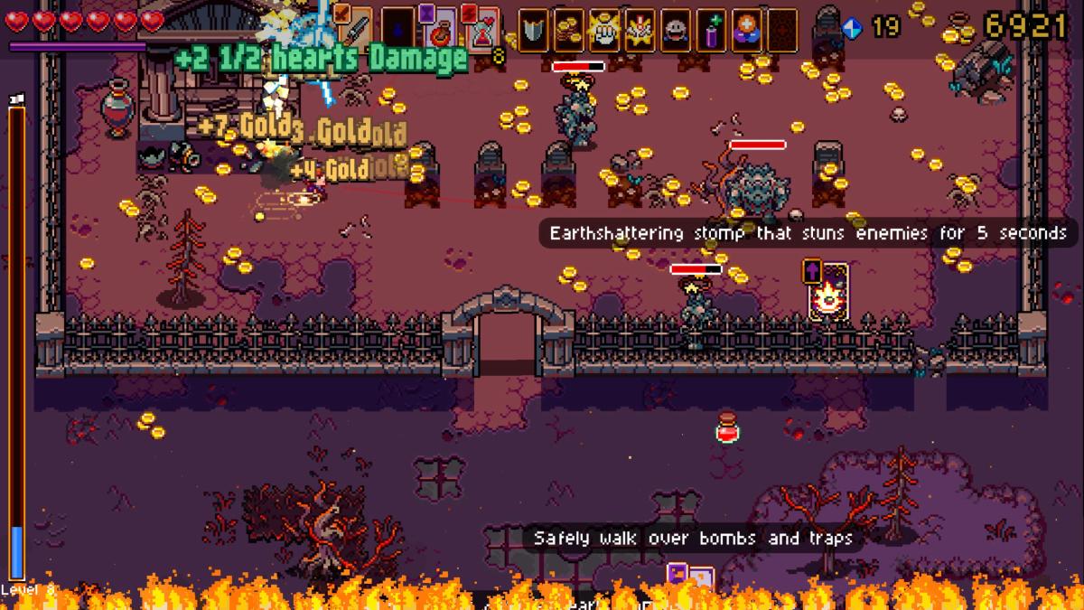 As you gobble up gold like a kleptomaniac hoover, you’ll need to scour the map for weapons and power-ups. There are bows, swords, rocket launchers and much more to find, along with other useful things like damage absorption, the ability to walk on water, and being able to fire off multiple projectiles. All of these things don’t last long, though—weapons have limited uses before breaking, and power-ups are usually on a timer. So you’ll need to swap constantly throughout the short 2–4 minute levels.