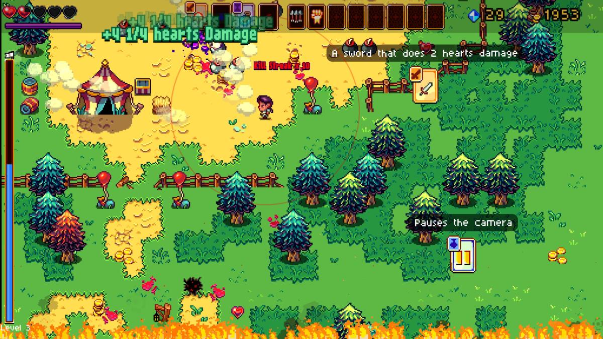 I mentioned a camp. These are your safe spaces, a momentary pause to catch your breath. Not that this is a stressful game, mind you. It’s pretty chill. The screen might always be scrolling, but unless you truly aren’t paying attention, you’ll be able to keep away from it fairly easily. I only died by scrolling a couple of times—the rest were from getting mobbed by monsters.